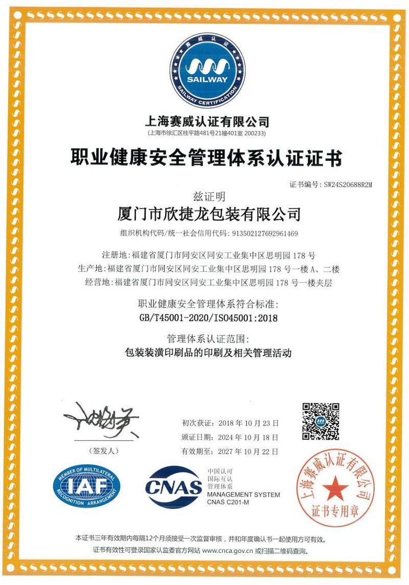 职业健康安全管理体系认证证书